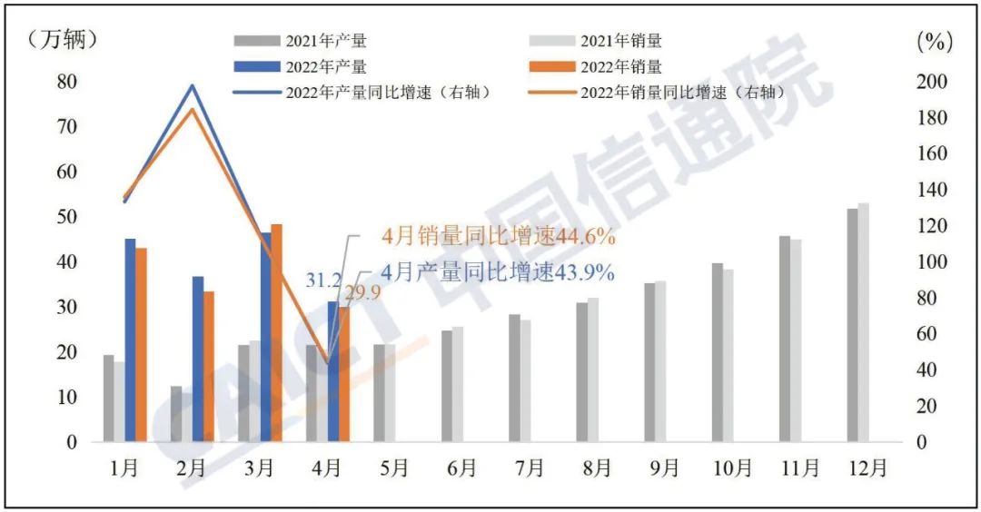 数据显示,4月份,我国新能源汽车产销分别完成31.2万辆和29.9万辆,同比分别增长43.9%和44.6%,增速较上月出现明显回落。相较于汽车行业整体产销分别同比下降了46.1%和47.6%,新能源汽车产销同比实现40%以上增长已属难得。