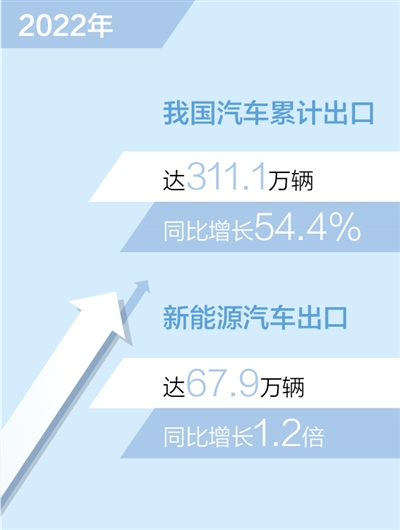 新能源汽车成为出口增长点。分车型看,2022年我国乘用车出口252.9万辆,同比增长56.7%;商用车出口58.2万辆,同比增长44.9%。新能源汽车出口67.9万辆,同比增长1.2倍。其中,去年11月,新能源汽车出口15.3万辆,环比增长5.5%,创下单月出口量新高。