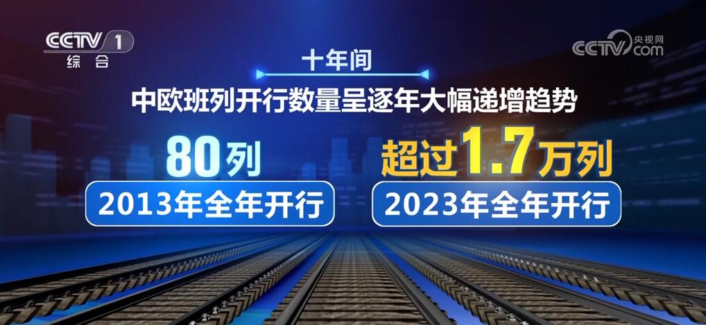 数据显示,十年间,中欧班列开行数量呈逐年大幅递增趋势。2013年全年开行80列,2023年全年开行数量已超过1.7万列。截至今年4月底,已连续48个月单月开行数量保持在千列以上。